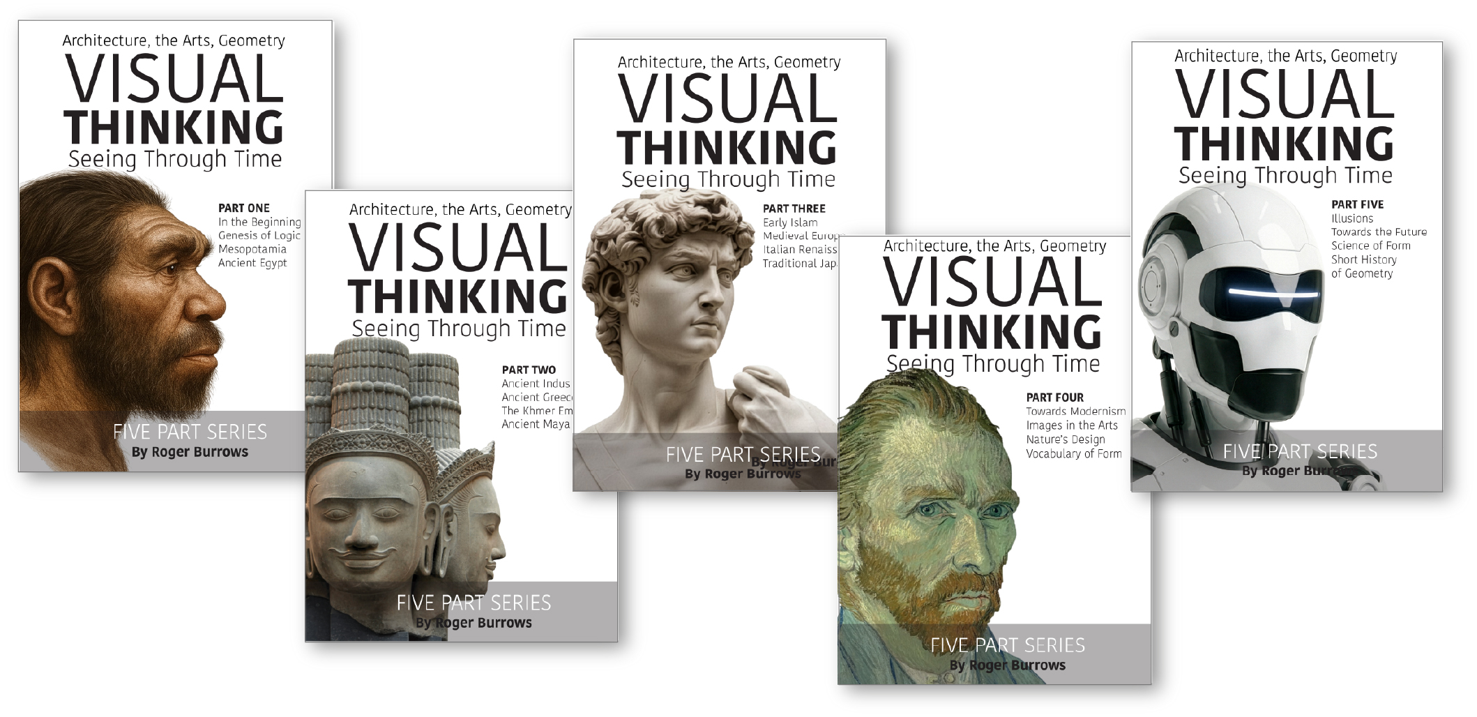 Visual Thinking, Seeing Through Time is a five-book series. It explores the development of visual logic from archaic humans through early civilizations. It continues into the age of artificial intelligence. The series examines how visual‑cognitive structures shape human reasoning across the arts. These structures affect architecture and geometry. This reveals deep connections between perception, culture, and design.